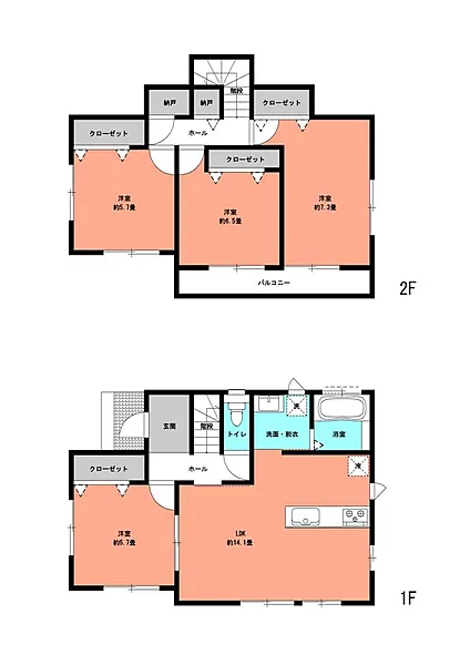 4LDK(洋室 5.7帖(1階) リビングダイニングキッチン - 14.1帖(1階) 洋室 6.5帖(2階) 洋室 7.3帖(2階) 洋室 5.7帖(2階))建物面積98.53㎡